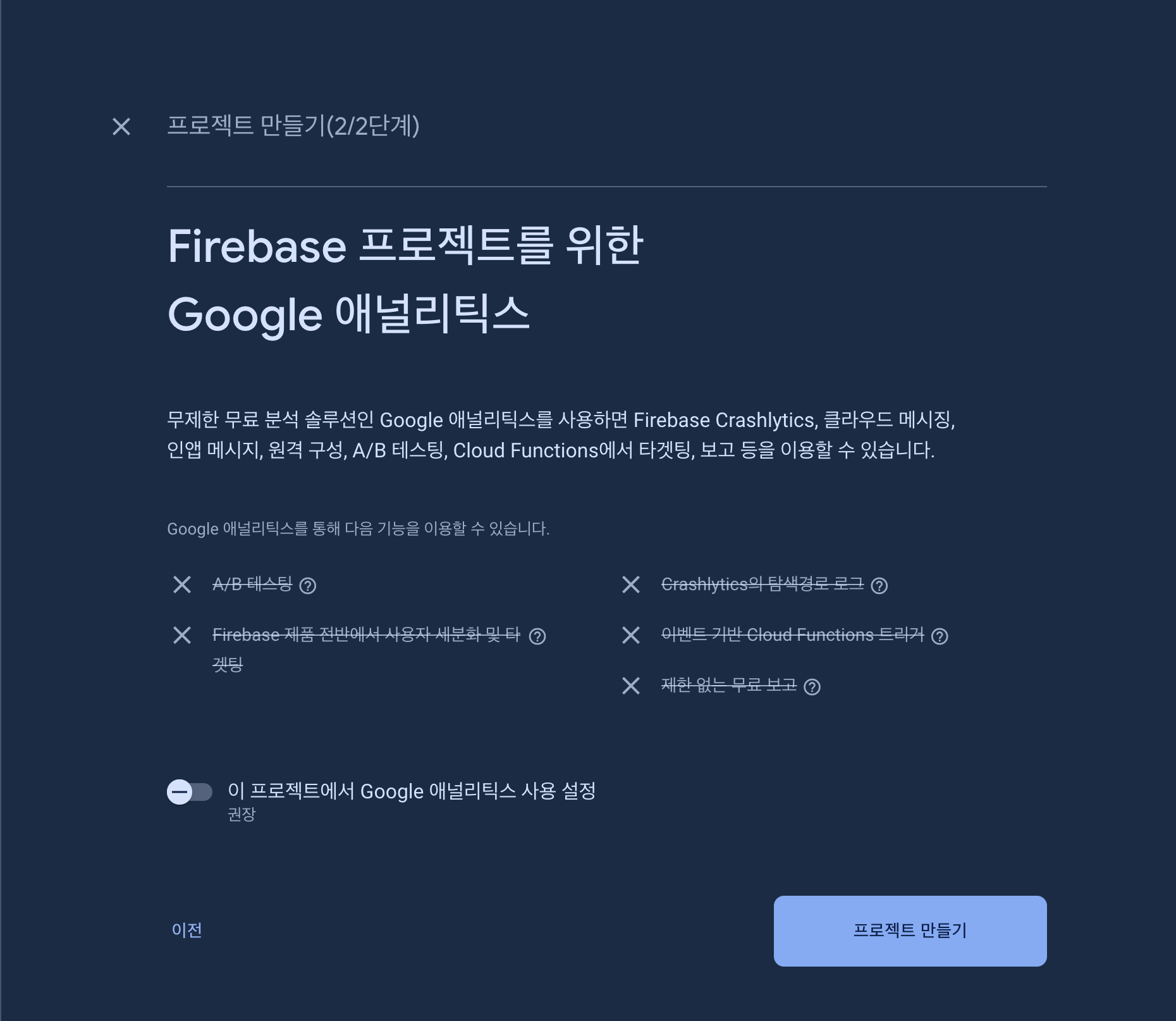 프로젝트 생성 시 애널리틱스를 통한 분석을 이용할 수 있습니다. 필요시 체크합니다.