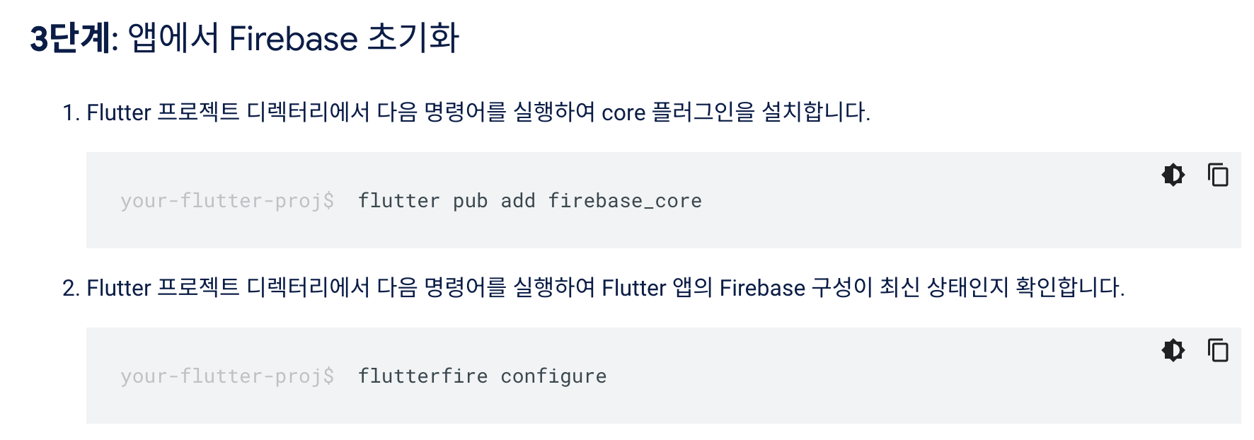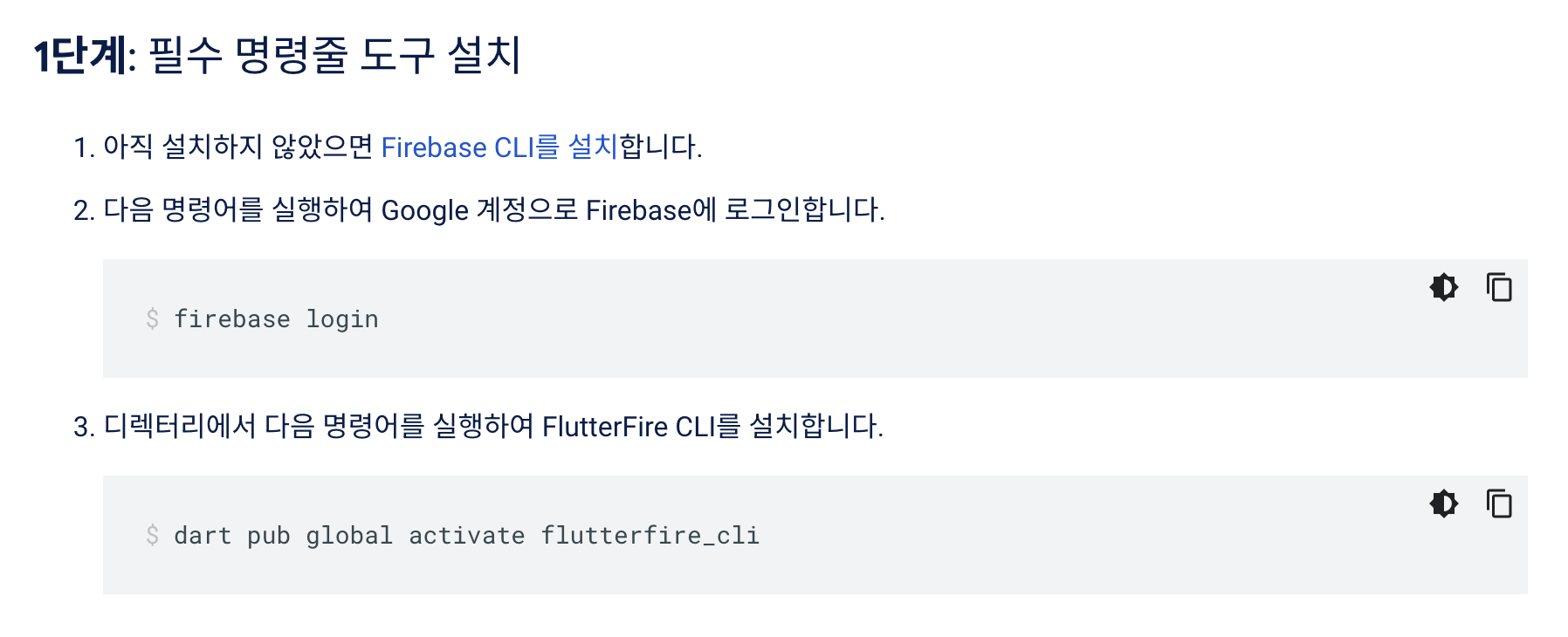 dart pub global activate flutterfire_cli -> 플러터에서 firebase를 사용함에 있어 필요한 파일들을 설정합니다.
